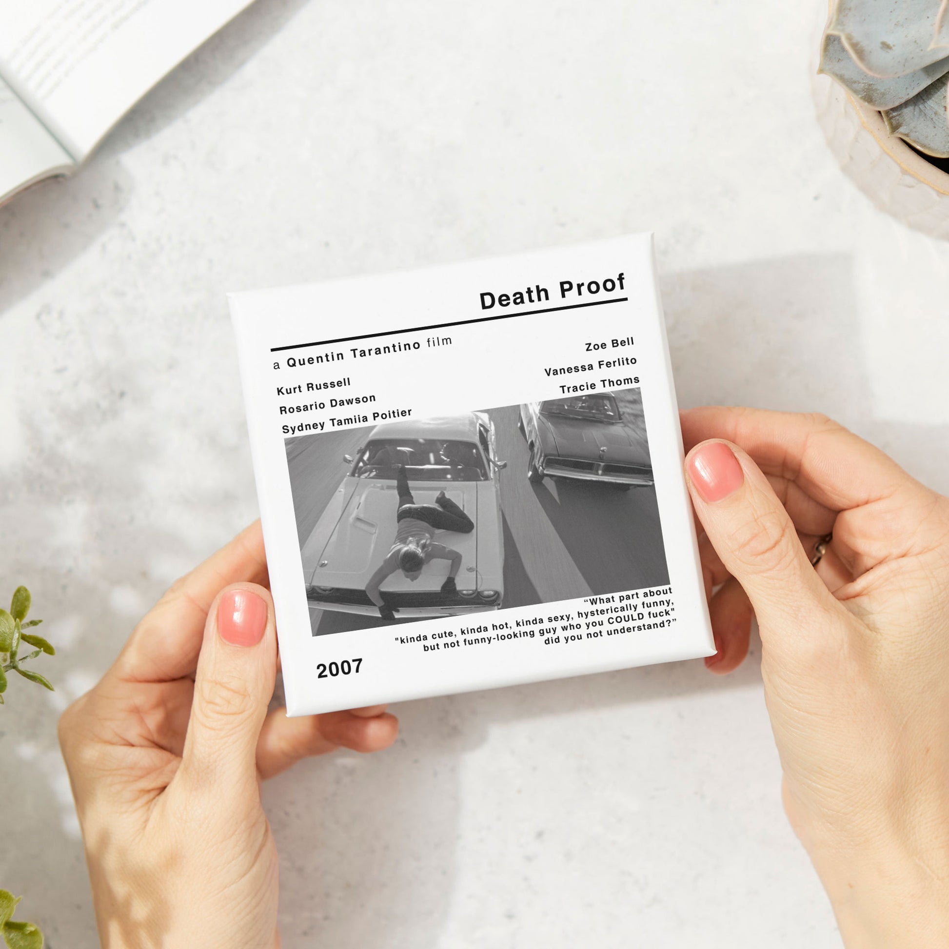 🎞️The modern style movie print of Death Proof adds a touch of nostalgia and cinephile flair to your space. Whether you're a fan of Quentin Tarantino's works or simply appreciate classic cinema, this coaster is a must-have addition to your collection.