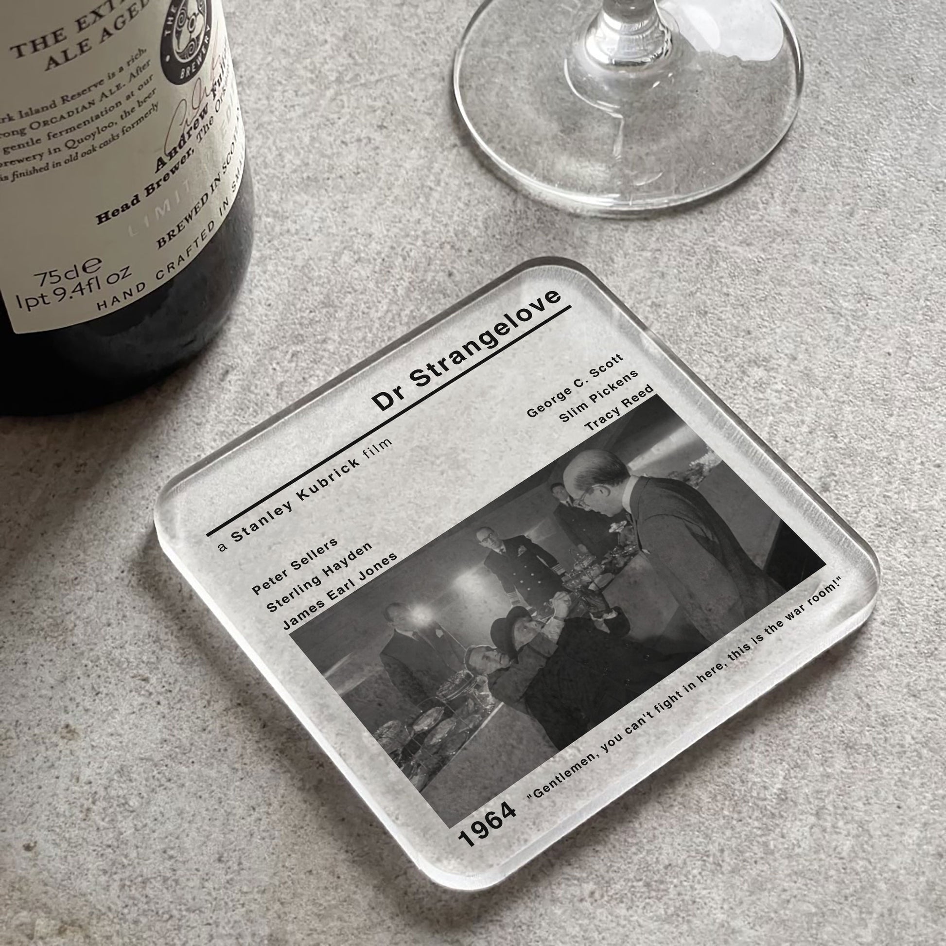 Add to your home decor with this contemporary style Dr Strangelove coaster. Designed in a minimalist movie poster style featuring Stanley Kubrick's iconic film, this coaster combines timeless charm with practical functionality.
