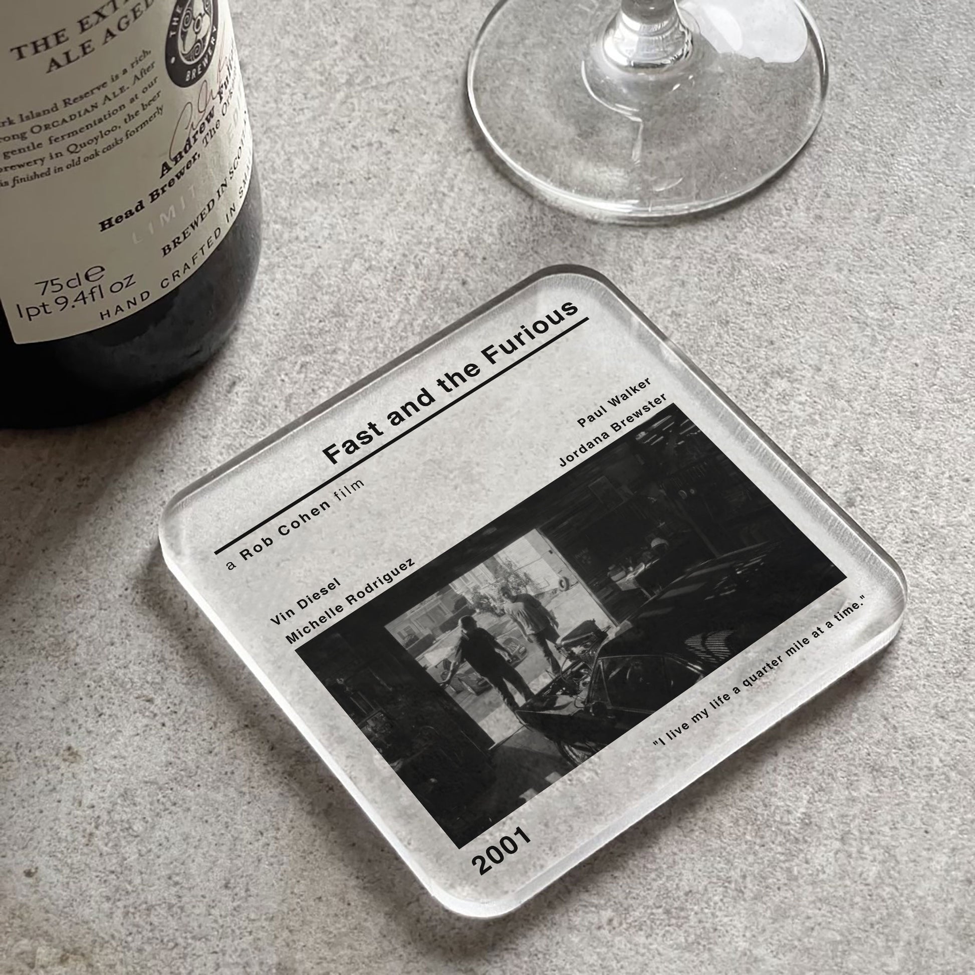 Add to your home decor with this contemporary style Fast and The Furious coaster. Designed in a minimalist movie poster style featuring Rob Cohen's iconic film, this coaster combines timeless charm with practical functionality.