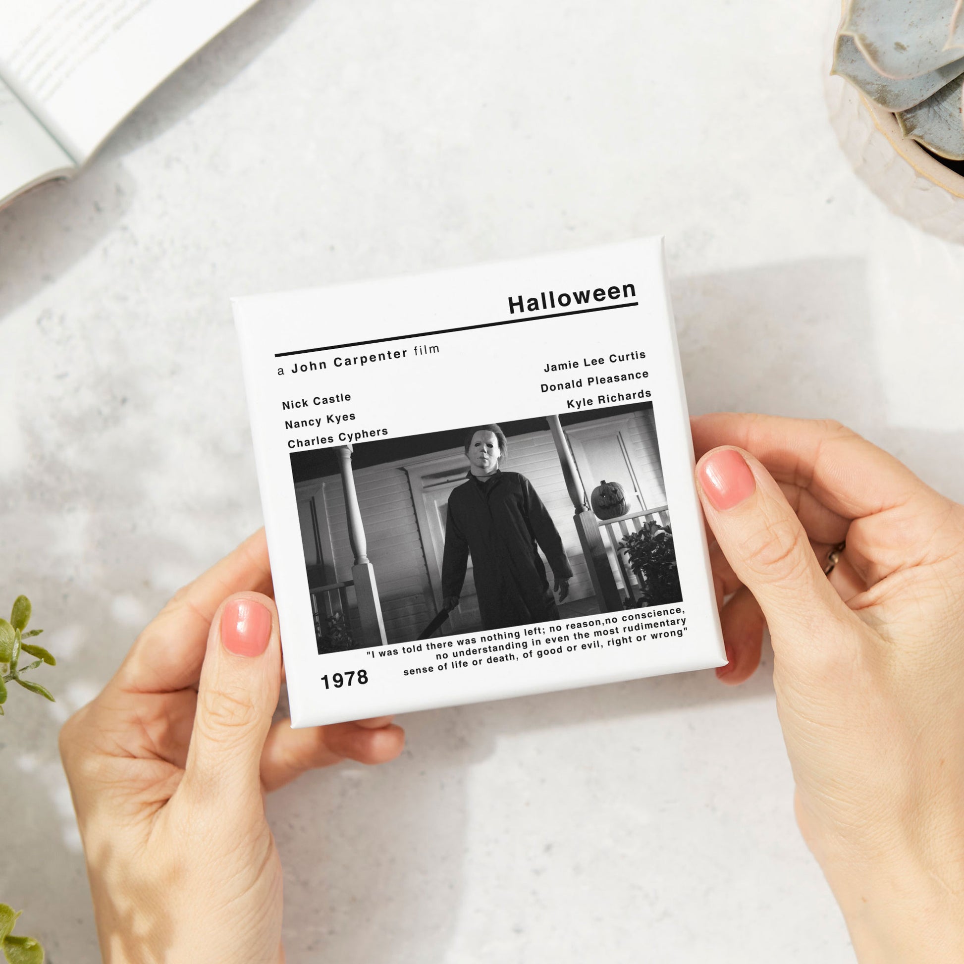 🎞️The modern style movie print of Halloween adds a touch of nostalgia and cinephile flair to your space. Whether you're a fan of John Carpenter's works or simply appreciate classic cinema, this coaster is a must-have addition to your collection.