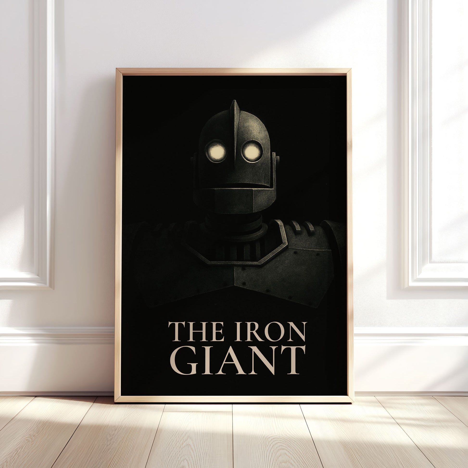 Step into the quiet vastness of childhood wonder with this striking Iron Giant poster. Designed in a minimalist yet deeply atmospheric composition, the artwork captures the towering silhouette of one of animation’s most iconic guardians — suspended between shadow and starlight. Bathed in darkness, with only restrained highlights defining form and scale, this piece balances immense power with quiet innocence, evoking the emotional depth and timeless humanity that make this cinematic legend unforgettable.
