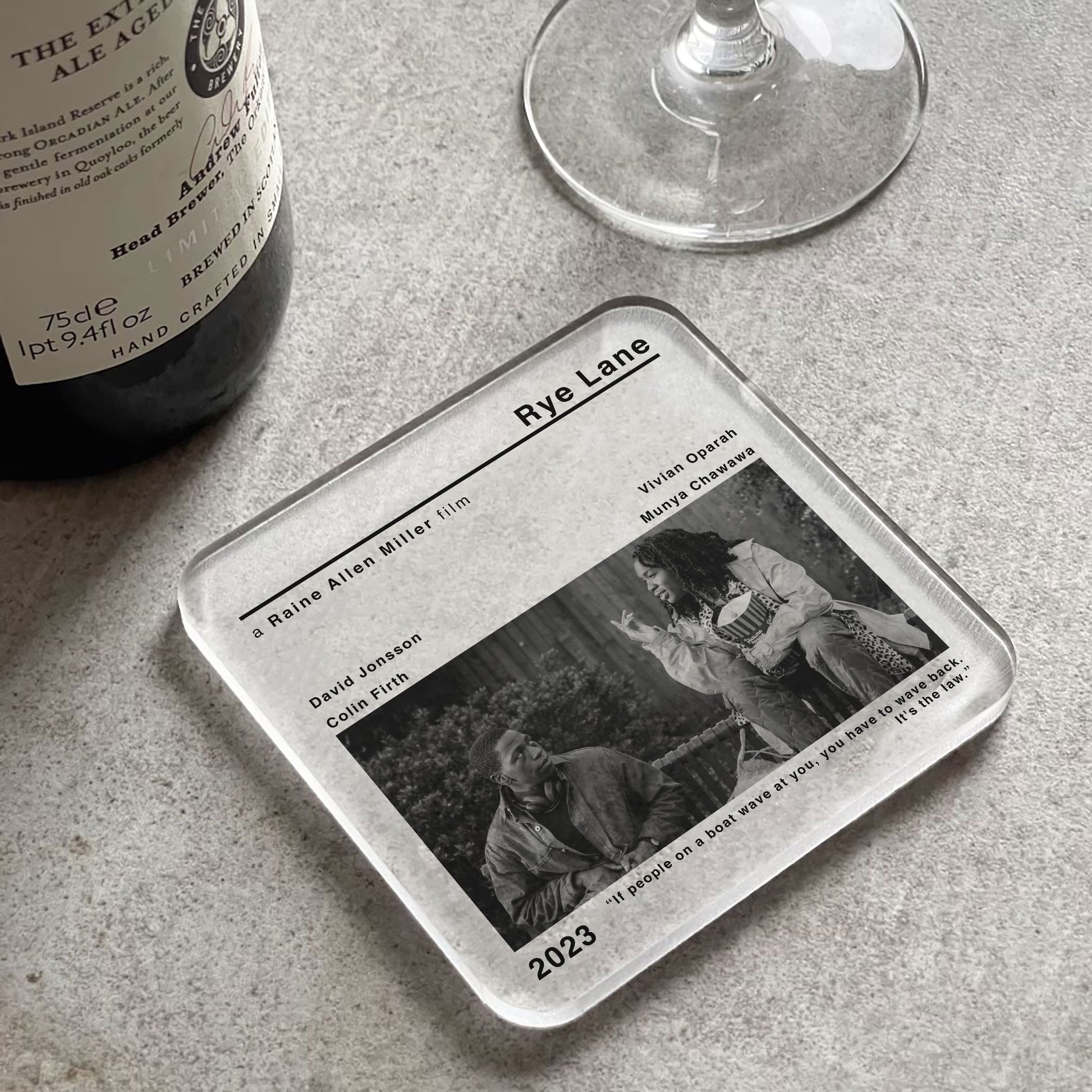 Add to your home decor with this contemporary style Rye Lane coaster. Designed in a minimalist movie poster style featuring Raine Allen Miller's film, this coaster combines timeless charm with practical functionality.