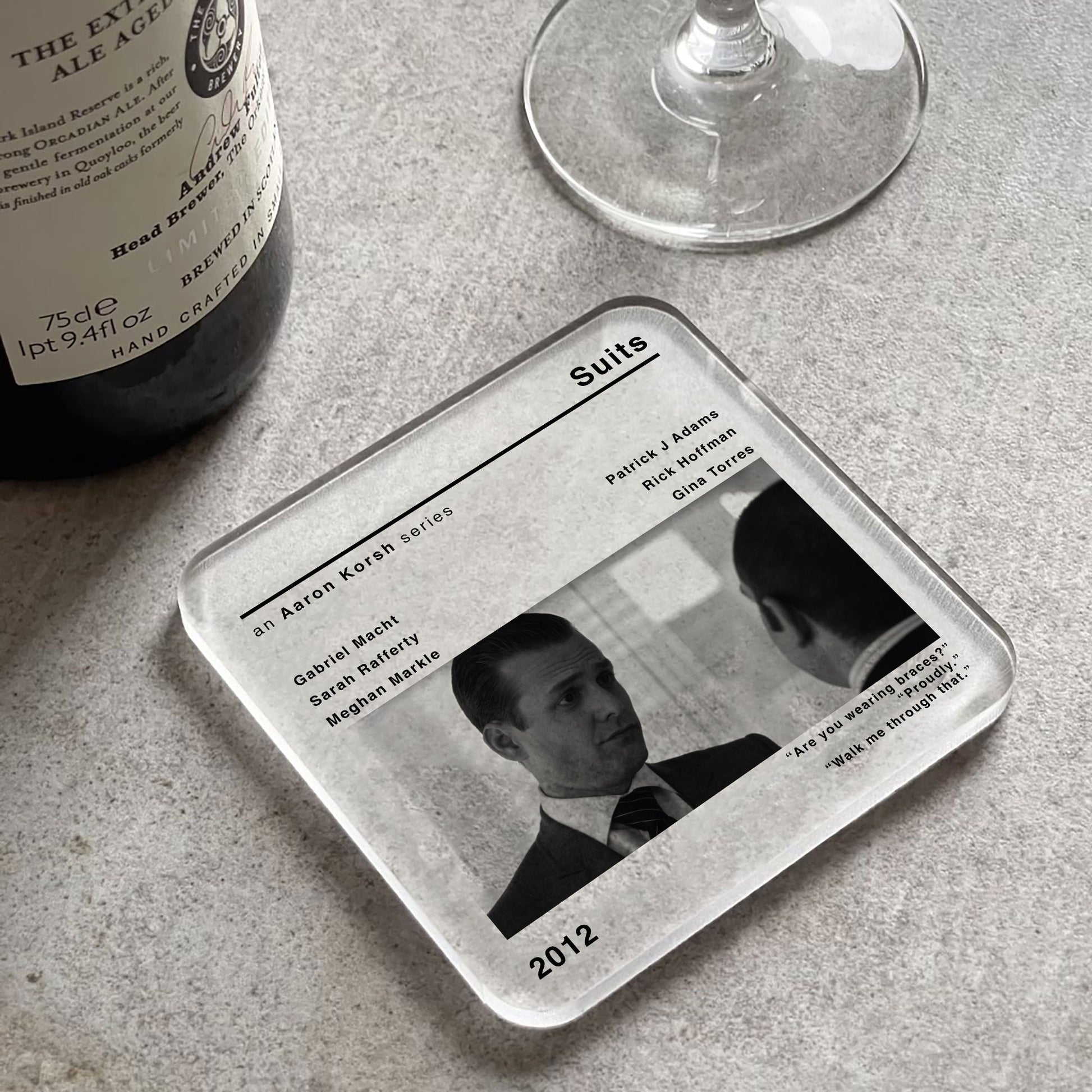 Add to your home decor with this contemporary style Suits coaster. Designed in a minimalist movie poster style featuring Aaron Korsh's iconic series, this coaster combines timeless charm with practical functionality.